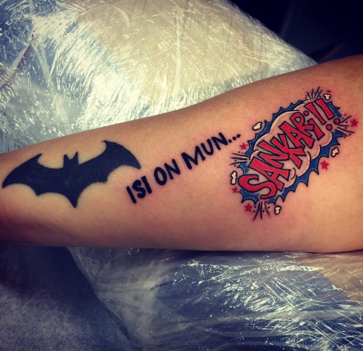 Some people loves masked heros, this one had old Bat-logo in her arm. She absolutely adores Batman and told me story about her dad. Dad is her hero and they share the “Batman-Love”… That’s how these stories are born. “Father is my hero” she said and wanted to tattoo that using some cool font and only black. I did take this little bit to the “hero-factor”… What if we do sound blast what they were using in 60’s Batman and write that “hero” part inside of it..? She loved the idea and we are ready to go, let’s see what’s coming next…