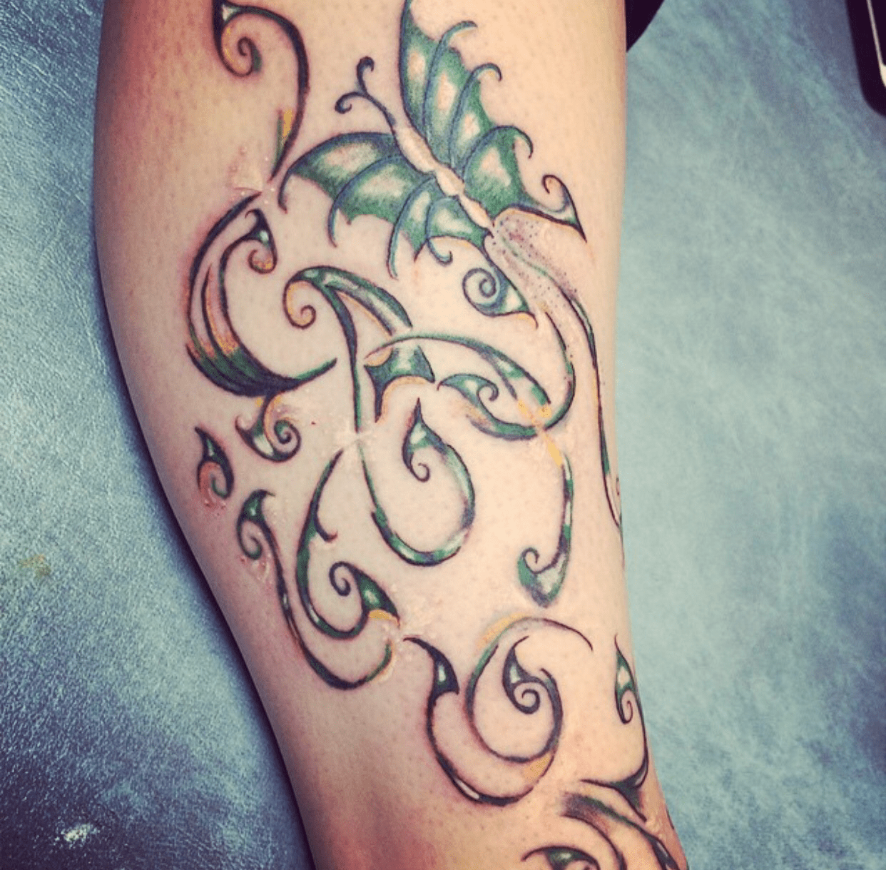What a great place to work, streching was easy to do and setting up was easy to do.. Also it’s not painful area for to tattoo and almost everyone can handle it. Colors were green white mixing and also yellow. Stencil was simple to do, only outlines and right size… (9round Shader) and (7flat shader) for colors/shades. (7round liner) for outlines and I was ready to go.