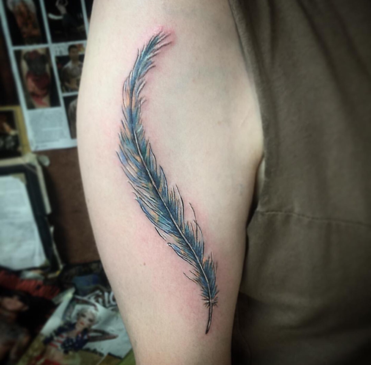 She wanted a blue feather to the hand. Really specific about what kind and what color.