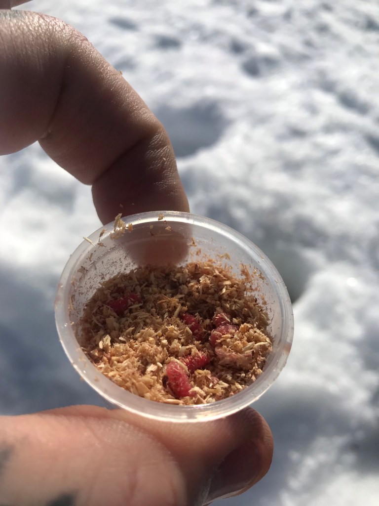 Earthworms are also good, but more expensive and you can’t go digging because of the frozen ground.