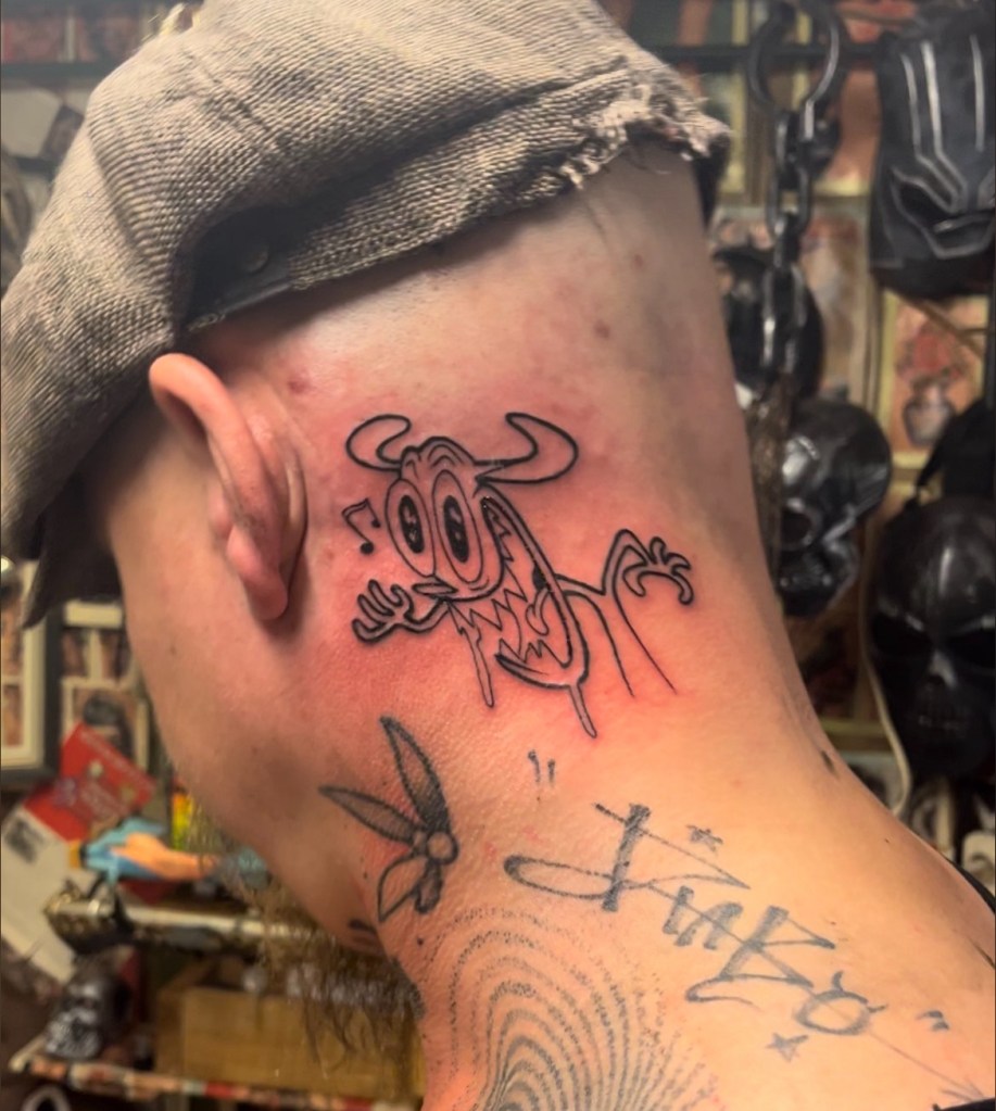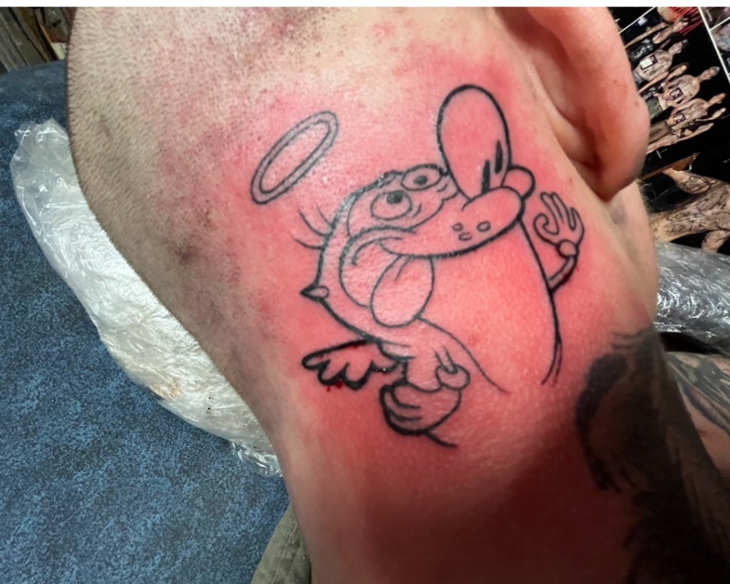 On the right side there’s a Stimpy whispering all those angelic words like the good self confidence. Both of these tattoos are on the “in progress”-state and there will be more coloring. Head area is quite tricky for tattoo to heal. The problem is this: “Tattoo heals too fast” and the colors get faded. We have found out the solution for the problem, hear me out! At first session we do outlines with 7round liner, then then the most important part is doing the most far outlines with 14/round liner of 9/round shader. After the healing (approximately 2 weeks) we colour and shade the hell out of the picture. With this system it does not matter if the tattoo heals too fast.